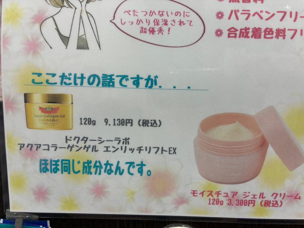 同じような成分構成の超有名ド●タ●シ●ラ●(ご想像にお任せします)(120g・9,130円)と比べても、モイスチャージェルクリームは 120g・3,300円(税込) と続けやすい価格。