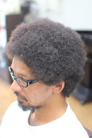 | Q 何cmあればアフロに出来ますか? A 約6cmあればアフロに出来ます。(ツーブロック・セニング・シャギーが入っている場合は無理な場合あり。) |